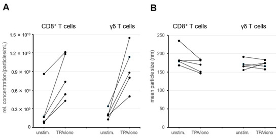 CD8+ αβ T cells or γδ T cells were left unstimulated (unstim.) or stimulated for 2 h with phorbol ester and ionomycin (TPA/iono), before EVs were isolated by differential centrifugation and ultracentrifugation and the particle concentration (A) and particle size (B) were analyzed by NTA. Data for five individual experiments with CD8+ αβ T cells or γδ T cells are shown. If less than 4 × 108 cells were plated, the particle concentration was extrapolated respectively for unstimulated and stimulated cells.