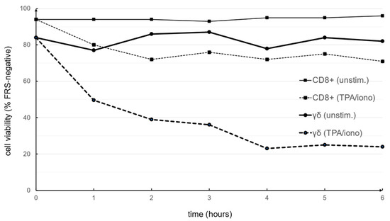 PHA-expanded CD8+ αβ T cells (squares and thin lines) and zoledronate-expanded γδ T cells (circles and thick lines) were left untreated or exposed to TPA and ionomycin for six hours. Every hour, cell viability was determined by flow cytometry using far red stain (FRS) exclusion.
