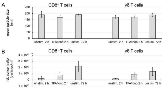 The NTA allowed us to check in parallel whether stimulation would influence the particle size. The mean particle size determined by NTA varied in individual experiments between 145 and 190 nm and did not change significantly with stimulation (Figure 1B). The high value (mean size 235.5 nm) in a single experiment for unstimulated EVs from unstimulated CD8+ αβ T cells was rather due to an unusual scattering of two of the four individual NTA measurements used for NTA data calculation.