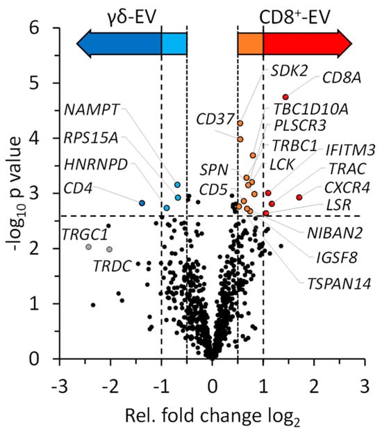 Quantitative analysis of EVs from expanded CD8+ T cells and zoledronate-stimulated γδ T cells. Individual proteins with significant fold-change differences are marked and indicated by their gene names within the volcano plot. In addition, we highlighted the TCR γ and δ chains although their fold-change difference did not reach significance. The color code of the arrows corresponds to Supplementary Table S2: Dark Red – Significantly higher abundant in EVs of CD8+ T cells (Strict); Light Red—Significantly higher abundant in EVs of CD8+ T cells (Moderate); Dark Blue—Significantly higher abundant in EVs of γδ T cells (Strict); Light Blue—Significantly higher abundant in EVs of γδ T cells (Moderate).