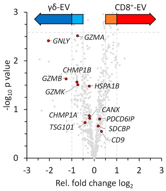 Quantitative analysis of EVs from expanded CD8+ T cells and zoledronate-stimulated γδ T cells. Individual EV-associated markers and effector proteins are highlighted and indicated by their gene names within the volcano plot. Color code as described in Figure 4.