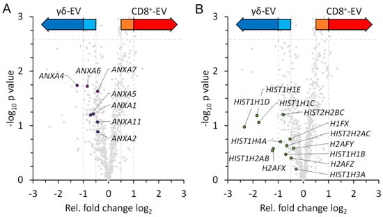 Quantitative analysis of EVs from expanded CD8+ T cells and zoledronate-stimulated γδ T cells. Individual annexins (A) and histones (B), which were more abundant in EVs from γδ T cells, are highlighted and indicated by their gene names within the volcano plot. Color code as described in Figure 4.