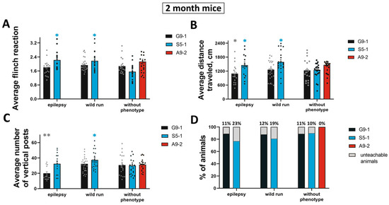 23]. When testing the acoustic startle reaction, the individuals of the S5-1 line with the epilepsy phenotype showed increased excitability (2.22 ± 0.16) compared to the G9-1 mice line (1.81 ± 0.09), which correlates with a reduced acoustic response in the individuals from the “no phenotype” group of the S5-1 line. In the “wild run” group, the S5-1 mice also showed high rates of the acoustic startle response (2.17 ± 0.15) compared to the G9-1 line (1.93 ± 0.09) (