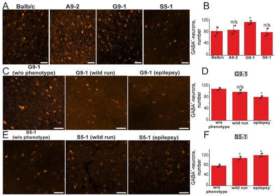 52]. In such genetic models of epilepsy, increased numbers of GABAergic neurons and inhibitory neurotransmission are hypothesized to have a synchronizing effect that results in a paradoxical improvement in some types of epileptic seizures. Thus, in the G9-1 mice, there was a trend toward an increase in the number of GABAergic neurons in the cerebral cortex, even without division into groups with epileptiform activity or wild run, while in the A9-2 line (without an epileptic phenotype) or S5-1, no increase was detected in the number of GABA-immunoreactive neurons compared to the control group (Balb/c). At the same time, in the cortical slices of the G9-1 mice in the group with an epileptic phenotype, a significant decrease in GABA-positive neurons was revealed, and, in the S5-1 line, on the contrary, an increase in the number of GABA-positive neurons was detected both in the “wild run” group and in the “epilepsy” group. Such discrepancies in the experimental data are descriptive of the characteristics of the generated mutants, and, in this study, we do not aim to describe or compare the inhibitory component of neurotransmission. However, there is compelling evidence in the literature regarding attempts to describe epilepsy simply as a failure of GABAergic inhibition, while other authors suggest that hyperinhibition masks hyperexcitation. We are inclined to believe that the “too much or too little GABA” paradigm does not work due to the complexity of the changes in the cortex after status epilepticus and the problems with the mechanistic understanding of epileptogenesis at this stage of the research, as shown in the work of Scharfman and Brooks-Kayal on the dentate fascia [