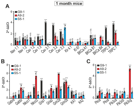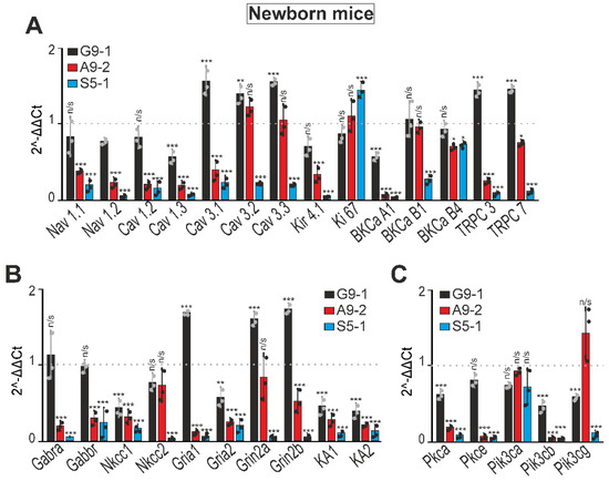 Figure 7A, red columns). In the S5-1 mutants, increased levels of Cav 3.2, Cav 3.3, Ki 67, TRPC3, and TRPC7 genes were detected, and the expression of Cav 1.3, Cav 3.1, Kir 4.1, and BKCA1 was reduced (