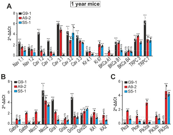 Figure 12). At the same time, in the G9-1 mutant neurons, there were decreases in the expression of the inhibitory GABA receptors and protein kinases (PI3K and PKC), which are considered to be neuroprotective. In the S5-1 and A9-2 mutants, the changes in the expression of the genes encoding the receptors of the excitatory component of neurotransmission were less pronounced; in the cortexes of both mice lines, there were increases in the expression of the Grin2b gene encoding the NMDAR subunit.