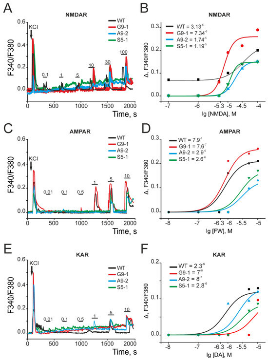 43]. We were able to demonstrate that the G9-1 mutants caused dramatic changes in the expression of the genes encoding excitatory glutamate receptors. These mutants showed increases in the expression of the genes encoding excitatory NMDARs, AMPARs, and KARs (