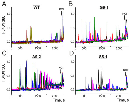 2+ impulses in neurons isolated from WT mice, G9-1, A9-2, and S5-1 mutants. Averaged results obtained on 6 cell cultures are presented. The presented data correspond with the results presented in