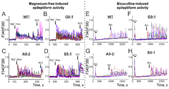 Thus, the neurons isolated from the cerebral cortexes of all three ENU mutant lines showed increased spontaneous Ca2+ activity compared to the WT neurons. The G9-1 neurons showed the most pronounced frequency and amplitude of Ca2+ signals. In the models of epileptogenesis, the neurons obtained from the mutant mice were also more excitable when a magnesium-free medium or blocking of GABA(A) receptors caused high-amplitude, high-frequency Ca2+ oscillations.