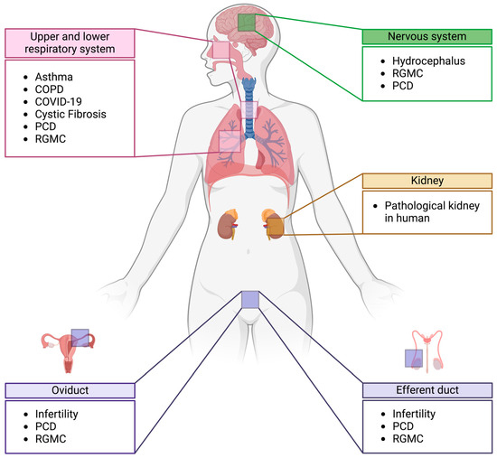 MCCs in human diseases. There are many pathological conditions across human tissues that are defective in MCC development and motility or have been linked to MCC-regulating genes. Pathological conditions involving MCCs were recorded in several tissues, such as the upper and lower respiratory systems, nervous system, kidney, oviduct and efferent duct. In the kidney, pathological conditions have been linked to ectopic development of MCCs. Created with BioRender.com.