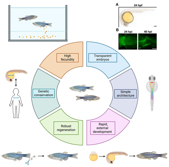 Zebrafish as a model to study development and disease. Zebrafish host many important traits, allowing them to be a great biomedical model to study embryogenesis and model disease states. (1) Transparent embryos: live zebrafish embryos are optically transparent and can be maneuvered to maintain transparency, allowing for development studies. (A) The zebrafish embryo at 24 hpf with almost no pigment across the body. Scale bar = 100 μm. (B) Graph depicts the migration of fluorescent 40 kDa Dextran conjugate in the proximal tubule of live embryo from 24 h post-injection (hpi) to 48 hpi. Scale bar = 100 μm. (2) Simple architecture: zebrafish have simpler organization than other animal models, while still maintaining complexity. For example, the zebrafish pronephros contains only two nephrons while being fully segmented, allowing for effective renal studies. (3) Rapid, external development: zebrafish development and organogenesis happen rapidly, allowing for organogenesis studies. (4) Robust regeneration: zebrafish can regenerate many tissues, allowing for recovery and regeneration studies. (5) Genetic conservation: zebrafish share about 70% of their genes with humans, allowing for studies of genetic diseases. (6) High fecundity: zebrafish are highly productive and can breed year-round in good conditions. Created with BioRender.com.