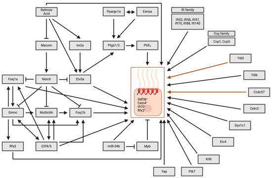 The E2f transcription factor family is essential for MCC development. The E2f transcription factor family has been known to be important for regulating cell cycle, apoptosis and transcription [212]. They are divided into different categories, including activators, repressors and inhibitors [129,213]. The MCC activators Gmnc and Mcidas form a complex with E2f4/5 and Dp1 to control the transcriptional program of MCCs [131,168,210,211]. In the zebrafish, researchers found that E2f5 played an important role in spermatogenesis and MCC differentiation. e2f5 zebrafish mutants not only developed gametogenesis defects but were also deficient in MCCs in the nasal placode and pronephric ducts. Additionally, E2f5 activates jag2b to inhibit MCC fate [129]. Furthermore, E2f5 deficiency is associated with a lack of expression of mcidas and foxj1b in the pronephros and absence of foxj1a expression in the nasal placode of e2f4+/−; e2f5−/− embryos [168]. In addition, E2f5 has a more important role in MCC development than E2f4, in which e2f5 mutants experienced abrogation of MCCs in the pronephros and a reduction in MCCs in the nasal placode, while MCCs were unaffected in e2f4 mutants. Interestingly, e2f4; e2f5 double mutants showed a drastic reduction in both MCCs in the pronephros and nasal placode, and only single cilia were present in pronephros. Furthermore, in e2f4; e2f5 double mutants, cilia movement was uncoordinated in the pronephros. These findings suggest that E2f4 and E2f5 have overlapping functional roles in MCC development in the nasal placode as well as the pronephros, with E2f5 playing a more substantial role [129,168].