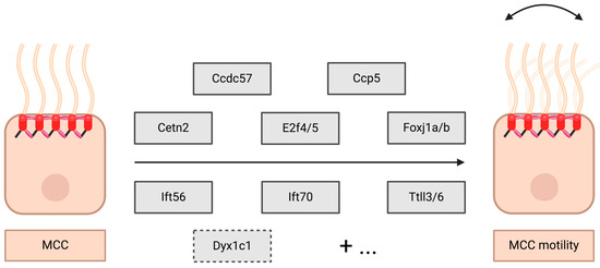 In addition to ift70, there are other ift genes that have been linked to MCC development in zebrafish. For example, Ift56, also known as Ttc26, identified as an IFT complex B protein, is important for cilia development. Morpholino knockdown of ift56 led to disruptive pronephric cilia development, and MCC beating coordination was significantly higher compared to WTs [239]. Next, ift88 is essential for MCC development, as loss of ift88 led to a significant loss of MCC of the nasal placode, as well as reduction of cilia in other organs such as retina and otic vesicles. Furthermore, loss of ift57 and ift52 leads to a significant loss of MCCs in the nasal placode. Interestingly, not all ift genes are essential for MCC development, as knockdown of ift140 did not produce as significant of a loss of MCCs in the nasal placode compared to ift88, ift57 and ift52 [240]. ift88 and ift57 could also potentially help with pronephric MCC formation, as knockdown of both genes leads to a reduction of cilia in the pronephros [241].