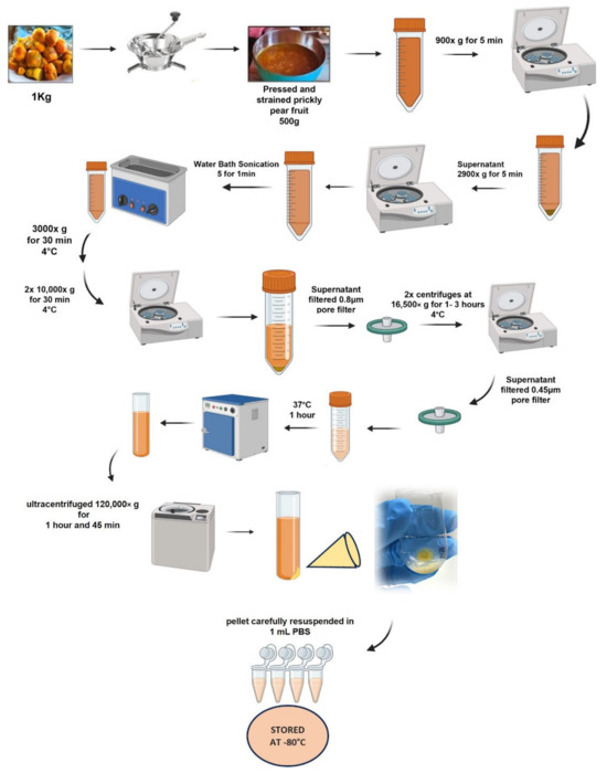 The prickly pear fruits were harvested from the countryside surrounding Palermo, the capital of Sicily, and from the countryside of Ustica, a small island in the Mediterranean Sea. The juice was extracted using a manual tomato press, which was used to sieve the prickly pear fruits and separate the seeds from the pulp. A quantity of 500 mL of juice was obtained from 1 kg of fruit. The juice was then processed to obtain the vesicle. Briefly, the juices of Opuntia ficus-indica were sequentially centrifuged using an Hermle LaborTechnik GmbH-Z 300 Universal Centrifuge (220.72 v04 rotor, Hermle, Wehingen, Germany) at 900× g for 5 min and 2900× g for 5 min to remove large particles and cellular debris. At the end of these initial centrifuges, the juice was sonicated with an ultrasonic bath using FALC LBS 1 Water Bath Sonication, 5 times for 1 min. Subsequent centrifuges were carried out using a refrigerating centrifuge Awel MF 20-R (AMF 20-8 rotor) (4 °C) (Awel international, Blain, France) at 3000× g for 30 min, and 2 × 10,000× g for 30 min. The supernatant was filtered using a 0.8 μm pore filter and centrifuged at 16,500× g for 1 h (4 °C); then, the supernatant was centrifuged at 16,500× g for 3 h (4 °C). The supernatant was filtered at 0.45 μm pore filter and then it was placed at 37 °C for 1 h. It was then centrifuged using a Beckman Optima L-90K ultracentrifuge (Ti 70 rotor, Beckman Coulter, Brea, CA, USA) at 120,000× g for 1 h and 45 min. Then, the supernatant was removed, and the resulting pellet was carefully resuspended in 1 mL PBS. Final samples of prickly pear fruit vesicles were aliquoted and stored at −80 °C until analysis.