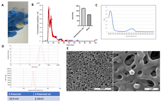 Isolation and characterization of FicoVes. (A) Yellow pellet obtained after ultracentrifugation at 120,000× g for 90 min at 4 °C. (B) Size distribution of FicoVes obtained through NTA. (C) Absorbance spectrum measure of FicoVes, spectrum range of 240–700 nm. (D) DLS analysis to investigate FicoVes size distribution. (E) Representative image of SEM analysis of FicoVes.
