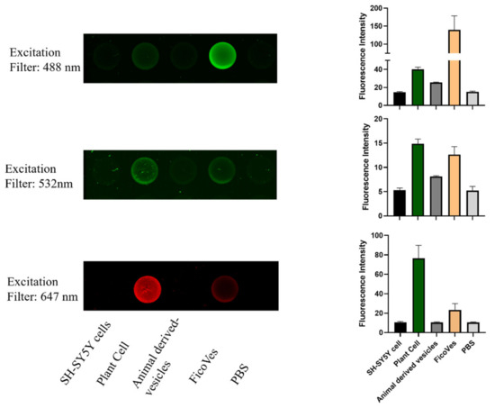 To further confirm the presence of these phytocomplexes, we performed fluorescence analysis by exciting the samples at specific wavelengths. Using appropriate excitation and emission filters, we successfully detected fluorescence, supporting the conclusion that these bioactive molecules are indeed present (Figure 3). In addition, we performed a comparative analysis of similar phytocomplexes in animal cells, animal-derived vesicles [34], and plant cells using fluorescence spectroscopy for quantification. As shown in Figure 3, when excited at 488 nm, we observed higher fluorescence in FicoVes compared to that emitted by plant cells. This suggests an enrichment of fluorescent compounds within the FicoVes. The absence of the same fluorescence in animal cells and animal-derived vesicles suggests that these phytocomplexes are specific to plant cells. Conversely, other excitation filters used consistently highlight the specificity of phytocomplexes typical of plant cells, but these are present in smaller quantities in the FicoVes compared to plant cells.