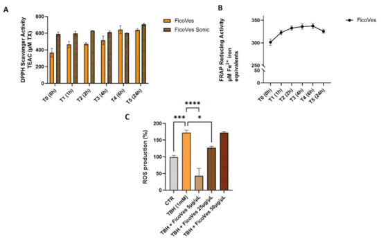 The antioxidant properties of FicoVes were studied through free radical scavenging (DPPH) and ferric reducing antioxidant power (FRAP) assays. Initially, we determined the radical scavenging capacity of the compounds through the DPPH assay. Along with the intact vesicles, we proceeded to sonicate them in order to disaggregate the vesicles to possibly release their contents into the solvent, thereby allowing us to better evaluate their antioxidant properties, since we hypothesized that the antioxidant activity was due to molecules contained within the vesicles. Figure 4A shows that FicoVes (25 µg/mL) have a TEAC of approximately 400. The vesicles that were sonicated showed a TEAC value of 600, as expected, higher than that of the FicoVes possibly due to the increased levels of antioxidant substances following ultrasonic disruption, leading to an enhancement in their antioxidant capacity. Moreover, it is interesting to note that the antioxidant capacity of FicoVes increases over time, unlike the antioxidant power of sonicated FicoVes, which remains stable. This leads us to hypothesize that the components responsible for the antioxidant activity are not immediately available, as if they were on the surface membrane, but become available gradually over time.