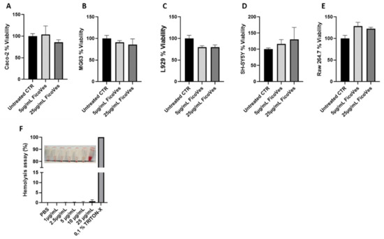 Effects of FicoVes on cell viability following treatment with FicoVes (5–25 µg/mL) for 24 h. (A) Viability of Caco-2 epithelial intestinal cells, (B) osteosarcoma cells MG63, (C) L929 murine dermal fibroblasts, (D) SH-SY5Y neuroblastoma cells, (E) RAW 264.7 murine macrophages. (F) Hemolysis assay RBC treated with 1, 2.5, 5, 10, and 25 µg/mL of FicoVes. Data are presented as means +/− SEM.