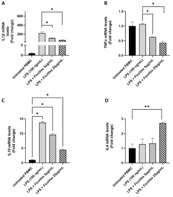 Effect of FicoVes on expression of pro-inflammatory cytokines in LPS-stimulated PBMCs. (A) IL-1β, (B) TNFα, (C) IL10, and (D) IL4 mRNA expression in FicoVes-treated cells followed by induction of inflammatory response by LPS (100 ng/mL) treatment. Data in the histograms are presented as the mean of three different experiments. Statistical significance was determined by comparison with the control group not treated with LPS/FicoVes. Statistical analysis performed with one-way analysis of variance (ANOVA) and Tukey’s multiple comparisons test. Differences were considered significant at * p < 0.05, ** p < 0.01.