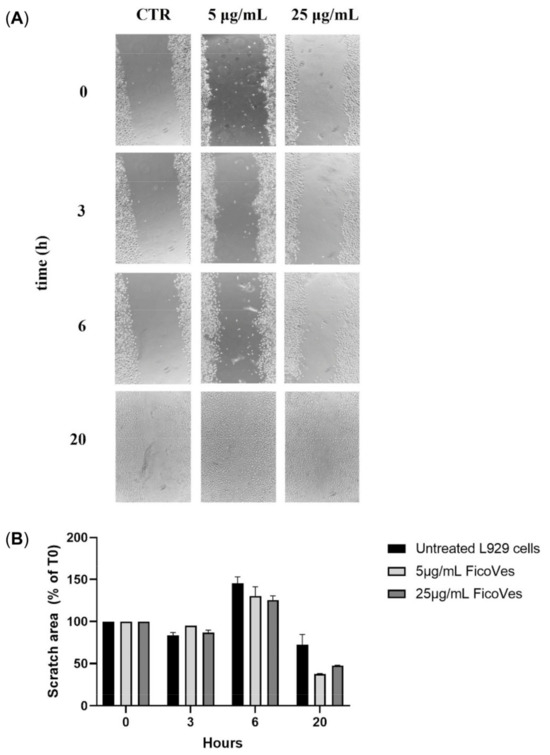 Wound closure on L929 cells monolayers treated with FicoVes. (A) Images of L929 monolayers at 0, 3 h , 6 h, and 20 h after the injury and the treatment with different concentrations (5 and 25 μg/mL) of FicoVes. (B) Histogram showing percentages of wound size at different time points calculated relative to the percentage of the wound area at T.0, which is considered 100%. The results are represented as mean ± SD of three experiments.