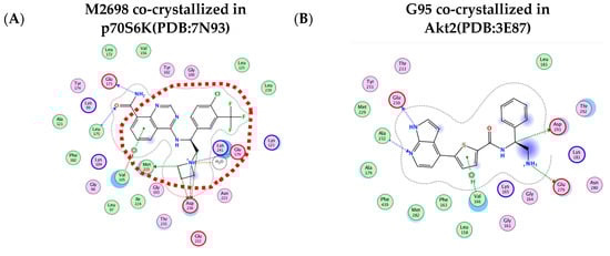 As previously mentioned, we used a small library of M2698 analogs (Figure S3) and a library of G95 conformations. Some M2698 analogs were derived from a 2021 publication [51], while others were newly designed by us. Although the OCA analysis suggested replacing N13 with aromatic or neutral atoms, we did not introduce aromatic modifications because we could not find an example of quinazoline bound to an aromatic group in the SureChEMBL database (https://www.surechembl.org/, access 23 December 2023). Docking into the binding sites of p70S6K and Akt2 was conducted using MOE template docking (MOE 2022.02). This approach ensured optimal alignment of the largest common fragment between the co-crystallized ligand and the docked molecule, enabling an assessment of the impact of N13 modifications on the predicted binding affinity. The rationale for designing the M2698 analog library for docking encompassed two key objectives: (1) mimicry of M2698-p70S6K interactions (depicted in Figure 5B) while introducing a neutral group at position N13 and (2) assessing the influence of incorporating a neutral group at position N13 on the docking scores in both p70S6K and Akt2. This modification could suggest reduced affinity, potentially mitigating off-target Akt2 toxicity [52].