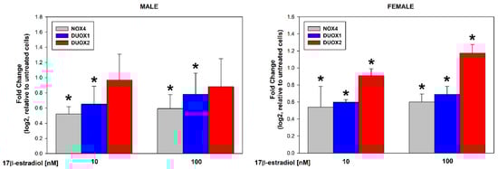 log2 fold change representing the mRNA expression of NOX4, DUOX1, and DUOX2 in cells derived from male or female porcine thyroid. Cells were incubated with 17β-estradiol at concentrations of 0.0 nM, 10 nM, or 100 nM. mRNA expression was calculated relative to the untreated control cells. Bars represent the mean ± SE of three independent experiments. * p < 0.05 vs. respective control, i.e., without 17β-estradiol (fold change equal to “0”).