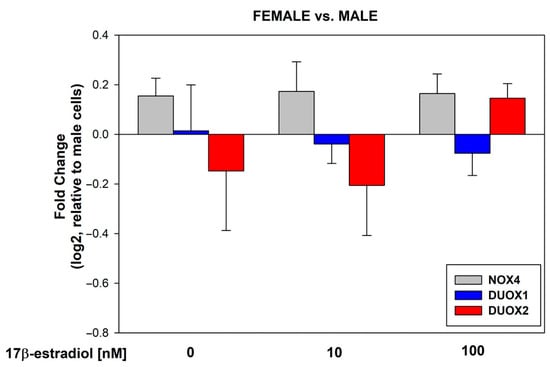 log2 fold change representing the mRNA expression of NOX4, DUOX1, and DUOX2 in female porcine thyroid cells relative to male porcine thyroid cells. Cells were incubated with 17β-estradiol at concentrations of 0.0 nM, 10 nM, or 100 nM. Bars indicate the mean ± SE of three independent experiments.