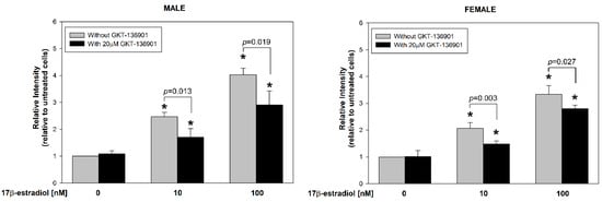 The level of ROS in cells derived from male or female porcine thyroid. Cells were incubated after the addition of 17β-estradiol (0.0 nM, 10 nM, or 100 nM) with or without GKT-136901 (20 µM). The level of ROS was evaluated by flow cytometry analysis with the use of CellROX™ Orange Reagent and was expressed relative to the untreated control group. Bars represent the mean ± SE of three independent experiments. * p < 0.05 vs. respective control (without 17β-estradiol).