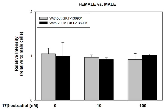 The level of ROS in cells derived from male and female porcine thyroid. Cells were incubated after the addition of 17β-estradiol (0.0 nM, 10 nM, or 100 nM) with or without GKT-136901 (20 µM). The level of ROS was evaluated by flow cytometry analysis with the use of CellROX™ Orange Reagent and was expressed relative to the respective male groups.