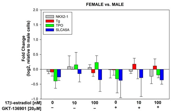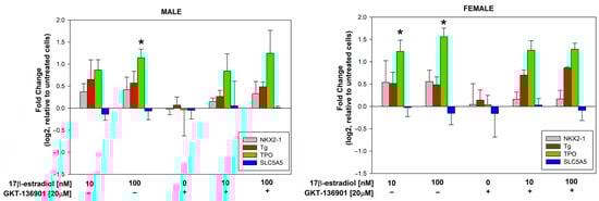 log2 fold change signifying the mRNA expression of thyroid-specific genes in cells derived from male and female porcine thyroid. Cells were incubated with 17β-estradiol at concentrations of 0.0 nM, 10 nM, or 100 nM, with or without GKT-136901 (20 µM). mRNA expression was calculated relative to the untreated control cells. Bars represent the mean ± SE of three independent experiments. * p < 0.05 vs. respective control (without 17β-estradiol).