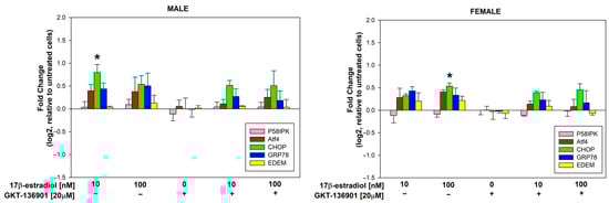 log2 fold change representing the mRNA expression of genes related to ER stress/UPR initiation in cells derived from male and female porcine thyroid. Cells were incubated with 17β-estradiol at concentrations of 0.0 nM, 10 nM, or 100 nM, with or without GKT-136901 (20 µM). mRNA expression was calculated relative to the untreated control cells. Bars represent the mean ± SE of three independent experiments. * p < 0.05 vs. respective control (without 17β-estradiol).