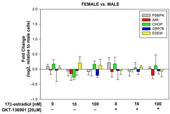 log2 fold change representing the mRNA expression of genes related to ER stress/UPR initiation in female porcine thyroid cells relative to male porcine thyroid cells. Cells were incubated with 17β-estradiol at concentrations of 0.0 nM, 10 nM, or 100 nM, with or without GKT-136901 (20 µM). Bars represent the mean ± SE of three independent experiments.