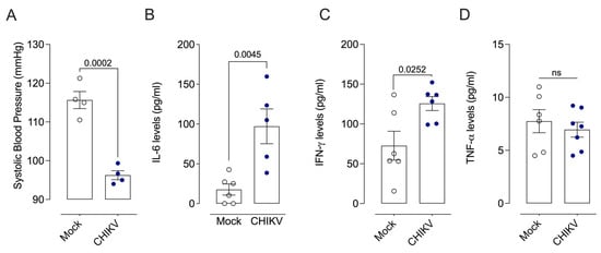 Characterization of the animal models infected by Chikungunya (CHIKV). CHIKV decreases systolic blood pressure and increases circulating cytokine levels in mice 48 h post-infection. (A): Measurement of systolic blood pressure (mmHg); (B–D): IL-6, IFN-γ, and TNF-α levels in the serum of mice 48 h after Mock (open white circles) or CHIKV (1.0 × 106 PFU/µL) (solid blue circles) administration. Data are expressed as mean ± S.E.M. p < 0.05 vs. WT_Mock; Student’s t-test was used for statistical analysis; n = 4–7 per group. WT: wild type–wild mice.