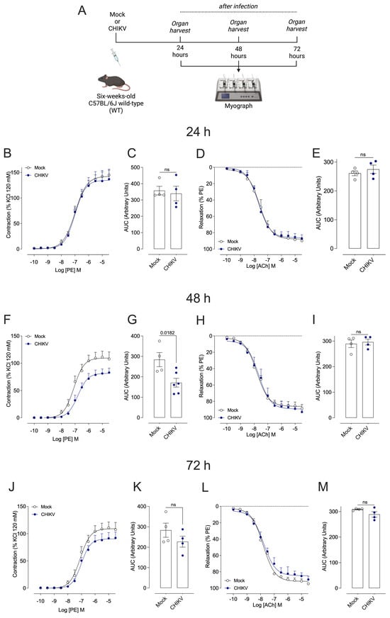 Cumulative concentration–effect curves for phenylephrine (PE) and acetylcholine (ACh) in endothelium-intact aortas from Mock-treated and CHIKV-infected mice. (A): Representative figure of the experimental design. (B,F,J): Vascular responses to PE—24, 48, and 72 h after Mock (open white circles) or CHIKV (1.0 × 106 PFU/µL) (solid blue circles) administration, respectively. (D,H,L): Vascular responses to Ach—24, 48, and 72 h after Mock (open white circles) or CHIKV (1.0 × 106 PFU/µL) (solid blue circles) administration, respectively. (C,E,G,I,K,M): The bar graphs show the area under the curve (AUC) in the concentration–effect curves. Data are expressed as mean ± S.E.M. p < 0.05 vs. WT_Mock; Student’s t test was used for statistical analysis; n = 4–6 animals per group.