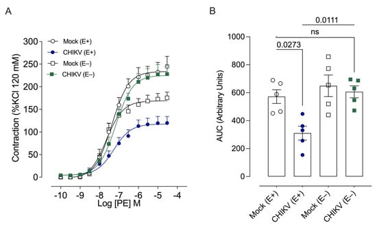 Cumulative concentration–effect curves for phenylephrine (PE) in endothelium-intact and endothelium-denuded aortic rings from Mock-treated and CHIKV-infected mice. (A): Constrictor responses to PE in arteries with or without intact endothelium, 48 h after Mock (open white circles and squares) or CHIKV (1.0 × 106 PFU/µL) (solid blue circles, and solid green squares) administration. (B): The bar graph shows the area under the curve (AUC) in the concentration–effect curves. Data are expressed as mean ± S.E.M. p < 0.05 vs. WT_Mock; One-way ANOVA test, followed by Dunnett post-test; n = 5–6 animals per group. E+: with endothelium; E–: without endothelium.