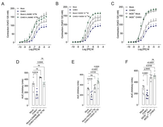 Cumulative concentration–effect curves for phenylephrine (PE) in the presence of pharmacological inhibitors (L-NAME and 1400W) and in iNOS –/– mice. (A–C): Vasoconstrictor responses to PE were determined in the presence of vehicle, L-NAME 10–4 M, or 1400W 10–4 M, and in iNOS–/– mice, 48 h after Mock (open white circles and squares) or CHIKV (1.0 × 106 PFU/µL) (solid blue circles, and solid green squares) administration. (D–F): The bar graphs depict the area under the curve (AUC) for the concentration–effect curves performed in vessels exposed to vehicle, L-NAME 10–4 M, and 1400W 10–4 M, and from iNOS–/– mice. Data are expressed as mean ± S.E.M. p < 0.05 vs. WT_Mock; Two-way ANOVA test, followed by Tukey’s post-test, was used for statistical analysis; n = 4–6 animals per group.