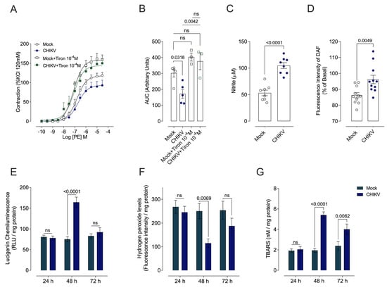 The variations in the contractile responses of aortic rings to PE between Mock- and CHIKV-infected mice were eliminated by Tiron (Figure 5A,B). CHIKV infection at 48 h increased nitrite concentration (indirect measurement of NO) (Figure 5C), NO levels (direct measurement of NO by fluorescence intensity of DAF) (Figure 5D), and O2•− generation (Figure 5E), and decreased H2O2 (Figure 5F). CHIKV also increased levels of TBARS 48 h post-CHIKV infection (Figure 5G). No changes in O2•− or H2O2 were detected 24 h or 72 h (Figure 5E,F) post-CHIKV infection, but TBARS levels remained increased 72 h post-infection (Figure 5G).
