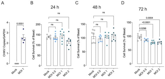 Cell viability after endothelial cell infection with MOIs (multiplicity of infection–ratio of CHIKV to EA.hy926 cells) of 0.5, 1.0, and 2.0 was determined by quantifying the reduction in 3-(4,5-dimethylthiazol-2-yl)-2.5 bromide of diphenyl tetrazolium (MTT, Sigma-Aldrich), as previously described by Mosmann (1983) [24]. In 96-well plates, 3.0 × 104 cells per well were plated and incubated in a CO2 incubator (5%) at 37 °C, overnight. Infections were performed using a 1.0 MOI for 48 h (h).
