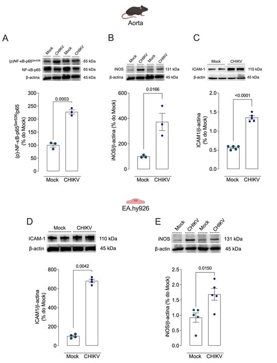 To address NF-κB activation in aortas from CHIKV-infected mice, the expression of the total and phosphorylated forms of p65 was assessed. Aortas of the WT_CHIKV mice exhibited increased expression of the proteins (p)-NF-κB p65Ser536/p65 total ratio (Figure 7A), iNOS (Figure 7B), and ICAM-1 (Figure 7C). In endothelial cells, CHIKV infection increased ICAM-1 (Figure 7D) and iNOS protein expression (Figure 7E).