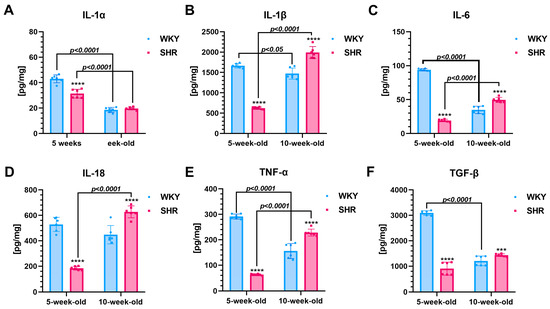 At 10 weeks of age, these cytokine levels significantly increased in the SHRs (p < 0.001 to p < 0.0001), with rises of ~26% in IL-1β, ~30% in IL-6, ~26% in IL-18, ~32% in TNF-α, and ~16% in TGF-β, while levels in the age-matched WKYs significantly decreased. Consequently, the IL-1α concentrations became comparable between 10-week-old SHRs and WKYs (Figure 1A–F).