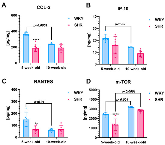 The levels of CCL-2 (~35%, Figure 2A), IP-10 (~35%, Figure 2B), and RANTES (~58%, Figure 2C) in the kidney of 10-week-olds WKYs were significantly decreased further (p < 0.05 to p < 0.0001), while in age-matched SHRs, these chemokine levels remained consistent with those observed in 5-week-old animals. As a result, the concentrations of all studied chemokines were normalized in the 10-week-old animals (Figure 2A–C). In the case of mTOR, by 10 weeks of age, levels of this chemokine showed a significant increase (p < 0.001 or p < 0.0001) in both 10-week-old WKYs (~25%) and SHRs (~53%) compared to their respective 5-week-old counterparts.