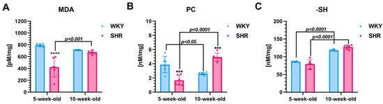 The renal levels of PC in 10-week-old SHRs increased significantly (p < 0.001), exceeding those observed in 10-week-old WKYs (~46%, Figure 3B). In contrast, the levels of MDA and -SH did not show significant differences (p > 0.05) between the SHRs and WKYs in 10-week-olds (Figure 3A,C).
