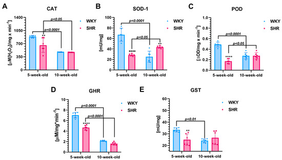 Further analyses indicated a significant reduction (p < 0.05–p < 0.0001) in the activity of CAT (~46%, Figure 4A), SOD-1 (~62%, Figure 4B), POD (~44%, Figure 4C), GHR (~69%, Figure 4D), and GST (~27%, Figure 4E) in 10-week-old WKY rats compared to their 5-week-old counterparts. Similarly, in 10-week-old SHR rats, the activity of CAT (~28%, Figure 4A) and GHR (~65%, Figure 4D) also decreased (p < 0.05, p < 0.0001; respectively) when compared to the 5-week-old SHRs. In contrast, the levels of SOD-1 (~34%, Figure 4B) and POD (~38%, Figure 4C) were significantly higher (p < 0.05) in the kidneys of 10-week-old SHR rats compared to the 5-week-old rats. The GST levels (Figure 4E) remained comparable between the two age groups of SHRs (p > 0.05).
