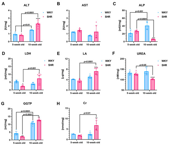The levels of alanine transaminase (ALT (A)), aspartate transaminase (AST (B)), alkaline phosphatase (ALP (C)), lactate dehydrogenase (LDH (D)), lactate (LA (E)), urea (UREA (F)), gamma-glutamyl transferase (GGTP (G)), and creatinine (Cr (H)) are presented as mean ± SEM (n = 6 animals per group). Notably, in 10-week-old SHRs, ALT, LDH, LA, and Cr levels are higher compared to age-matched WKYs. Conversely, urea and ALP levels are lower in 10-week-old SHRs compared to their WKY counterparts. Statistical significance is indicated as follows: * p < 0.05, ** p < 0.01, *** p < 0.001, and **** p < 0.0001 for differences between SHRs and WKYs; p < 0.05, p < 0.01, p < 0.001, and p < 0.0001 for differences between juvenile and mature rats of the same strain.