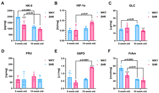 The levels/activity of hexokinase II (HK-II (A)), hypoxia-inducible transcription factor-1 α (HIF-1α (B)), glucose (GLC (C)), fructose (FRU (D)), glucose-6-phosphate dehydrogenase (G6PD (E)), and fructosamine (FrAm (F)) are shown as mean ± SEM (n = 6 animals per group). In 5-week-old SHRs, HK-II and FrAm levels are notably lower compared to their age-matched controls. In contrast, in 10-week-old SHRs, HIF-1α and G6PD levels are significantly higher than in their corresponding controls. Statistical significance is indicated as follows: * p < 0.05, *** p < 0.001, and **** p < 0.0001 for differences between SHRs and WKYs; p < 0.05, p < 0.01, and p < 0.0001 for differences between juvenile and mature rats of the same strain.