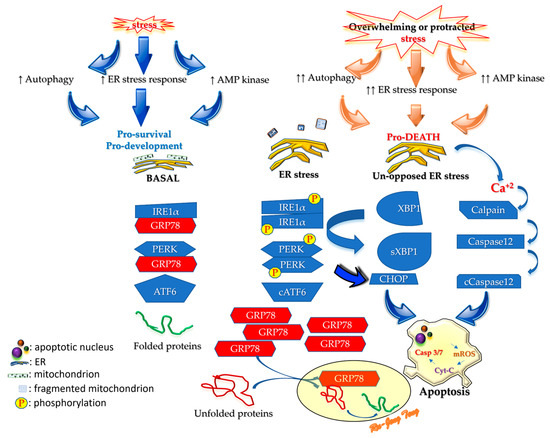 There are three specialized proteins, namely, inositol-requiring enzyme 1α (IRE1α), protein kinase R-like endoplasmic reticulum kinase (PERK), and activating transcription factor 6 (ATF6), in the ER that sense overloaded unfolded proteins (Figure 1) [73]. These three sensors are regularly chaperoned by an ER-resident binding immunoglobulin protein (BiP) called glucose-regulated protein 78 (GRP78). BiP/GRP78, or HSPA5, is a family member of heat shock protein 70 (HSP70). BiP/GRP78 binds newly synthesized proteins as they are translocated into the ER and maintains them in a state competent for subsequent folding, oligomerization, and post-translation modification.