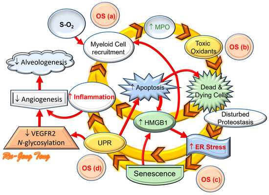 The ER is a subcellular organelle synthesizing surfactants [17], proteins, lipids, and cholesterols [18]. It intimately interacts with other organelles, essential for cell homeostasis. The ER is sensitive to OS, however, which can result in ER stress [19]. ER stress has been implicated in several lung disorders, including hyperoxia (HOX)-induced lung injury [20]. Our recent report was the first to show increased ER stress in human BPD lungs [16]. We further identified that ER stress is interrelated with autophagy, apoptosis, sterile inflammation, and cellular senescence [21]. All these associated pathologic changes can inhibit alveolar formation and reduce the lung growth potential. In animal studies, we then demonstrated that caffeine and chemical chaperones attenuated the severity of HOX-induced rat BPD by ameliorating ER stress. Later, we identified the crucial role of myeloperoxidase (MPO)-induced OS in BPD [22]. We demonstrated decreased ER stress in BPD rat lungs by treating rat pups with the reversible MPO inhibitor N-acetyl-lysyltyrosylcysteine amide (KYC) with improved alveolar formation [21]. This new observation raises the possibility of using MPO inhibitors in ER stress-mediated disorders.