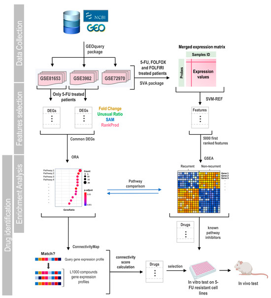 Figure 1. General flowchart of the experimental approach. In this work, three data series were selected from the GEO database. Studies contained gene expression data from tumors of CRC patients treated with different chemotherapies. Patients were followed up to record tumor relapse or death after treatment. First, we selected patients treated only with 5-FU and used different methods to obtain DEGs between groups with and without tumor relapse in each data series. Then, we performed an overrepresentation analysis of pathways (ORA) based on common identified DEGs. These genes were also used for screening of potential drugs able to reverse the expression profile associated with recurrence by the L1000 project of ConnectivityMap. Then we extended our studies by in-corporating patients treated with other 5-FU-based chemotherapies and constructing a gene ex-pression matrix by merging data from different studies. Using SVM-REF algorithm, genes were ordered based on their informative capacity among the phenotypes. With the 5000 most informa-tive genes, a GSEA analysis was carried out. Based on this analysis, we selected a set of drugs to test in vitro and in vivo.