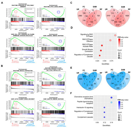 Figure 2. Gene set enrichments and DEGs associated with 5-FU monotherapy resistance. (A,B) Representative upregulated (left) and downregulated (right) gene sets in the recurrent phenotype according to Gene Set Enrichment Analysis (GSEA) for selected 5-FU-treated patients from the GEO dataset (A) GSE39582 and (B) GSE81653. NES and FDR values are indicated within each graph. Positive and negative enrichments are indicated with upward- and downward-pointing arrows, respectively. (CF) DEGs analysis. Venn diagrams of overexpressed (C) and underexpressed (E) genes identified by four statistical methods (FC: Fold Change; RP: Rank Product; SAM: Significance Analysis of Microarray; UR: Unusual Ratio) for series GSE39582 (left diagram) and GSE81653 (right diagram); intersections indicate genes detected by two or more methods. (D) Reactome functional classification of upregulated (D) and downregulated (F) genes detected as DEGs in both datasets. Dot size is proportional to the number of genes associated with a term. Dot color intensity indicates the adjusted p-value resulting from the over-representation analysis. This graph displays only significant terms (p < 0.05).