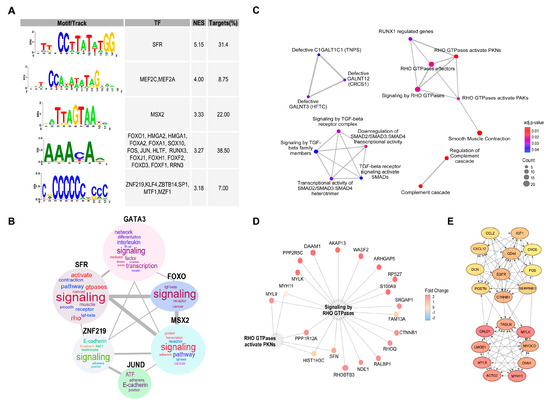 Figure 3. Regulation of DEGs associated with 5-FU-resistant phenotype. (A) Transcription factor binding sites enriched in promoter regions of upregulated genes in the 5-FU recurrent transcriptome. NES and target gene percentages are indicated. The motif/tracks column shows sequence logos. The horizontal axis represents base positions (Adenine: green, Cytosine: blue, Thymine: red, Guanine: orange) in the DNA, with the 3' end indicating strand orientation. The vertical axis shows information in bits, and letter height reflects base frequency at each position. (B) Word cloud showing the most frequent terms in the enrichment analysis result for each group of genes controlled by a transcriptional factor. The size of the word is proportional to the frequency the term appeared in the over-representation analysis (p > 0.05). (C) Enrichment map for visualizing the pathway/function relationships of DEGs associated with recurrence. Dot size is proportional to the number of genes associated with a term. Dot color intensity indicates the adjusted p-value resulting from the over-representation analysis. The thickness of the gray lines represents the level of connection between pathways. This graph displays only significant terms (p < 0.05). (D) Cnetplot showing the DEGs related to the RHO GTPases pathway; dot color indicates the fold change for the recurrent condition. (E) Top 20 hub genes identified by the CytoHubba Cytoscape plugin. A greater red color intensity is associated with the highest number of connections in the total DEGs PPI network.
